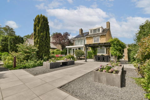 De royale tuin (ca. 16,0 x 13,0 meter) is een oase van rust en privacy. Hier kan je in alle seizoenen genieten van het buitenleven: van een zonnige ontbijttafel in de ochtend tot sfeervolle diners in de avond. Er is een gezellige overkapping met een houthaard waar je een leuk zitje kan creëren en achterin de tuin vind je een ruime berging en een dubbele garage perfect voor het stallen van een auto, fietsen of het opbergen van tuingereedschap.